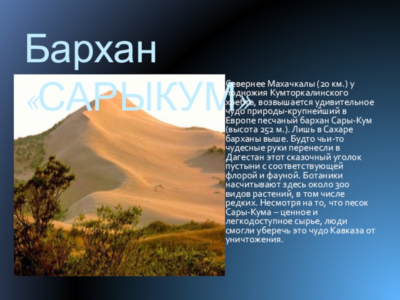 чудо природы-крупнейший в Европе песчаный бархан Сары-Кум (высота 252 м.). Лишь в Сахаре барханы выше. Будто чьи-то чудесные руки перенесли в Дагестан этот сказочный уголок пустыни с соответствующей флорой и фауной. Ботаники насчитывают здесь около 300 видов растений, в том числе редких. Несмотря на то, что песок Сары-Кума – ценное и легкодоступное сырье, люди смогли уберечь это чудо Кавказа от уничтожения.