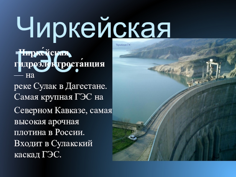 Чирке́йская гидроэлектроста́нция — на реке Сулак в Дагестане. Самая крупная ГЭС на