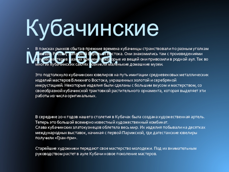 разным уголкам Кавказа, России, Западной Европы и Востока. Они знакомились там с произведениями других мастеров разных времен. Некоторые из вещей они привозили в родной аул. Так во многих кубачинских саклях возникли маленькие домашние музеи.