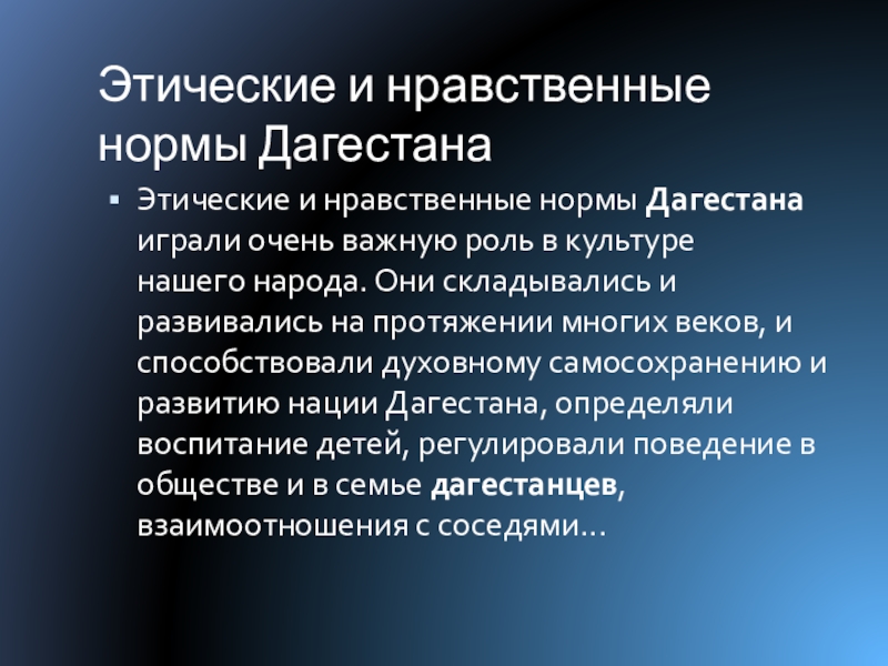 важную роль в культуре нашего народа. Они складывались и развивались на протяжении многих веков, и способствовали духовному самосохранению и развитию нации Дагестана, определяли воспитание детей, регулировали поведение в обществе и в семье дагестанцев, взаимоотношения с соседями...