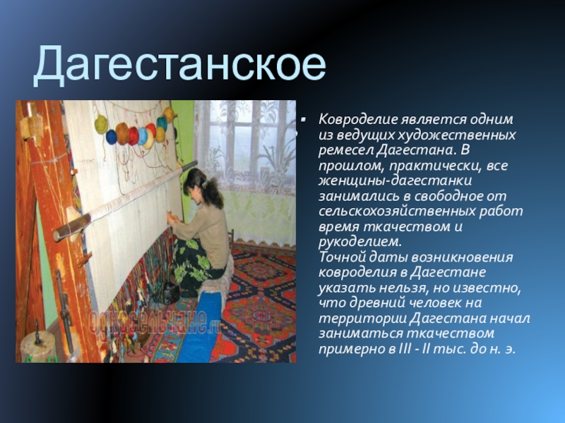практически, все женщины-дагестанки занимались в свободное от сельскохозяйственных работ время ткачеством и рукоделием.