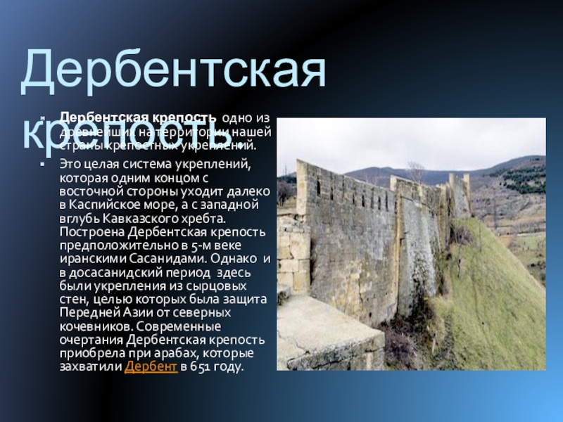 Это целая система укреплений, которая одним концом с восточной стороны уходит далеко в Каспийское море, а с западной вглубь Кавказского хребта. Построена Дербентская крепость предположительно в 5-м веке иранскими Сасанидами. Однако и в досасанидский период здесь были укрепления из сырцовых стен, целью которых была защита Передней Азии от северных кочевников. Современные очертания Дербентская крепость приобрела при арабах, которые захватили Дербент в 651 году.