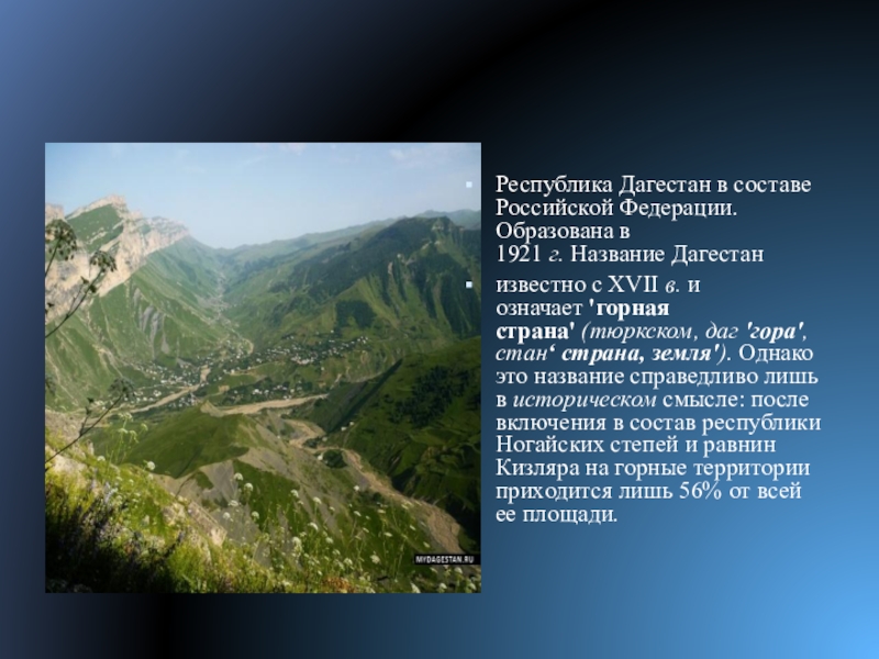 даг 'гора', стан‘ страна, земля'). Однако это название справедливо лишь в историческом смысле: после включения в состав республики Ногайских степей и равнин Кизляра на горные территории приходится лишь 56% от всей ее площади.