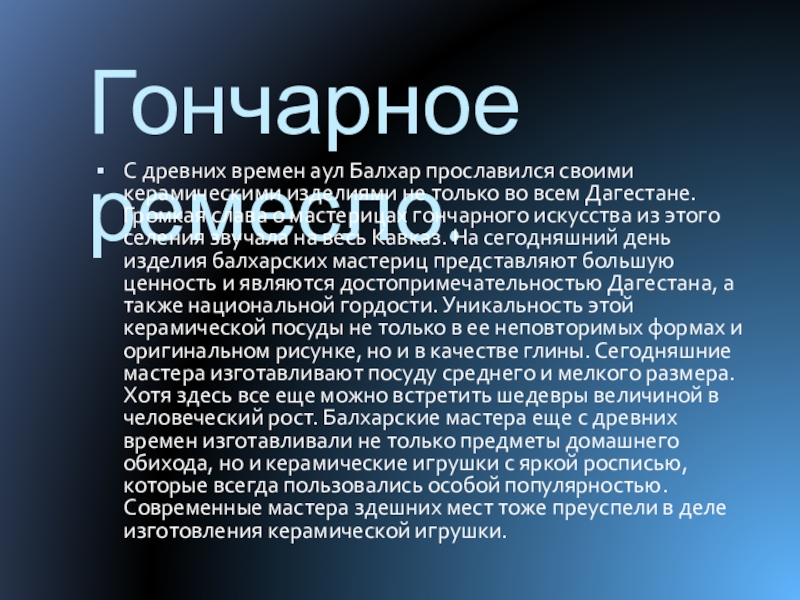 только во всем Дагестане. Громкая слава о мастерицах гончарного искусства из этого селения звучала на весь Кавказ. На сегодняшний день изделия балхарских мастериц представляют большую ценность и являются достопримечательностью Дагестана, а также национальной гордости. Уникальность этой керамической посуды не только в ее неповторимых формах и оригинальном рисунке, но и в качестве глины. Сегодняшние мастера изготавливают посуду среднего и мелкого размера. Хотя здесь все еще можно встретить шедевры величиной в человеческий рост. Балхарские мастера еще с древних времен изготавливали не только предметы домашнего обихода, но и керамические игрушки с яркой росписью, которые всегда пользовались особой популярностью. Современные мастера здешних мест тоже преуспели в деле изготовления керамической игрушки.