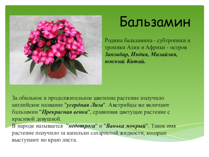 В народе называется "недотрога" и "Ванька мокрый". Такое имя растение получило за капельки сахаристой жидкости, которые выступают но краю листа.