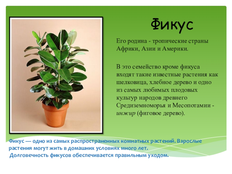 Фикус — одно из самых распространенных комнатных растений. Взрослые растения могут жить в домашних условиях много лет.