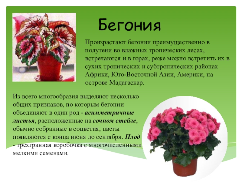 Из всего многообразия выделяют несколько общих признаков, по которым бегонии объединяют в один род - асимметричные листья, расположенные на сочном стебле, обычно собранные в соцветия, цветы появляются с конца июня до сентября. Плод - трехгранная коробочка с многочисленными мелкими семенами.