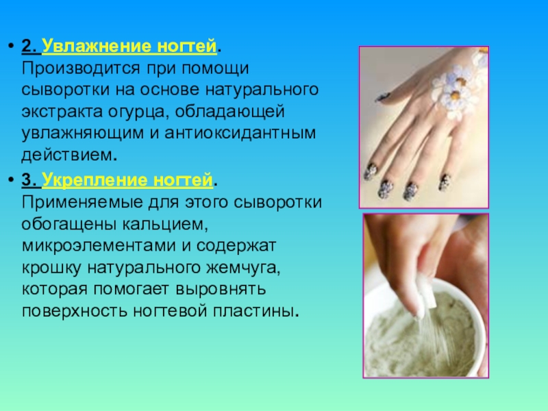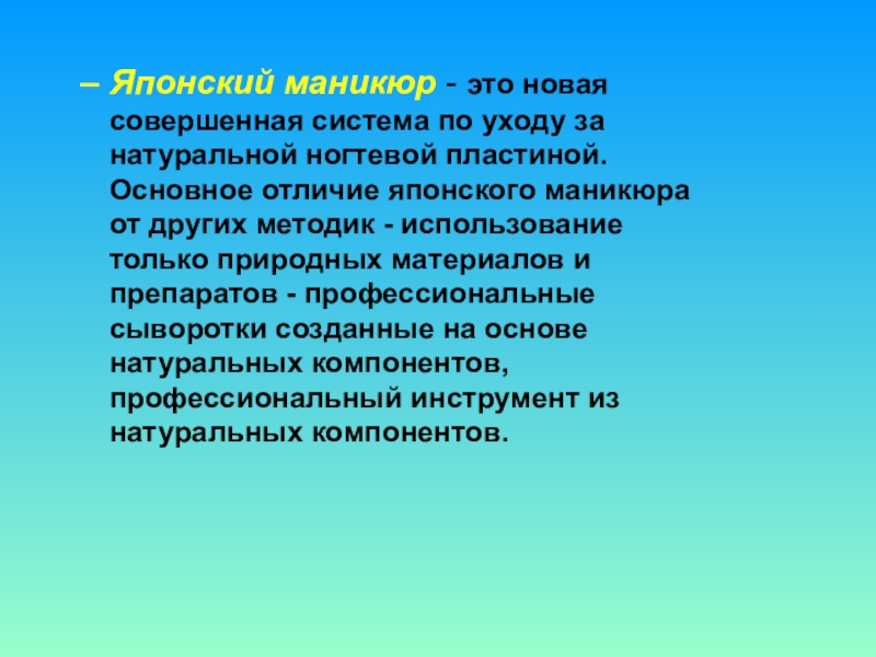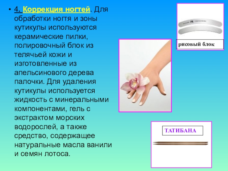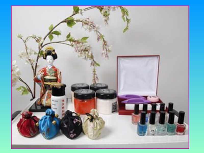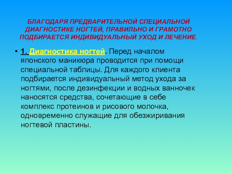 1. Диагностика ногтей. Перед началом японского маникюра проводится при помощи специальной таблицы. Для каждого клиента подбирается индивидуальный метод ухода за ногтями, после дезинфекции и водных ванночек наносятся средства, сочетающие в себе комплекс протеинов и рисового молочка, одновременно служащие для обезжиривания ногтевой пластины.