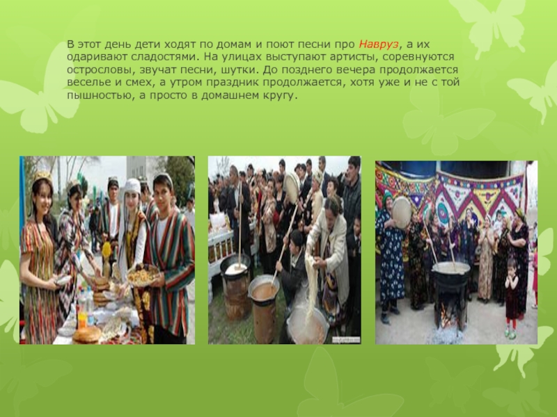 Навруз, а их одаривают сладостями. На улицах выступают артисты, соревнуются острословы, звучат песни, шутки. До позднего вечера продолжается веселье и смех, а утром праздник продолжается, хотя уже и не с той пышностью, а просто в домашнем кругу.