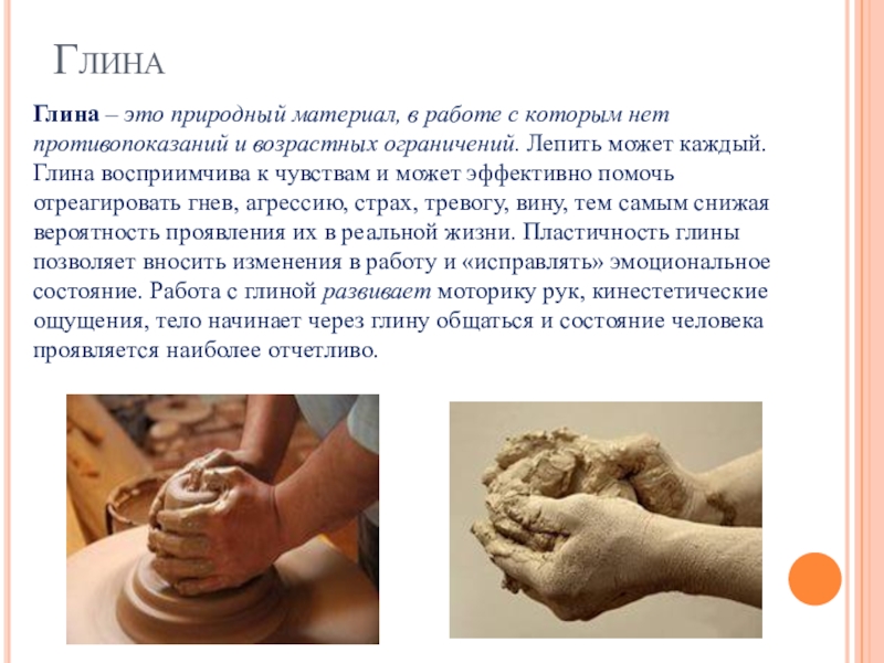 возрастных ограничений. Лепить может каждый. Глина восприимчива к чувствам и может эффективно помочь отреагировать гнев, агрессию, страх, тревогу, вину, тем самым снижая вероятность проявления их в реальной жизни. Пластичность глины позволяет вносить изменения в работу и «исправлять» эмоциональное состояние. Работа с глиной развивает моторику рук, кинестетические ощущения, тело начинает через глину общаться и состояние человека проявляется наиболее отчетливо.