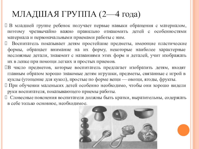 Воспитатель показывает детям простейшие предметы, имеющие пластические формы, обращает внимание на их форму, некоторые наиболее характерные несложные детали, знакомит с названиями этих форм и деталей, учит изображать их в лепке при помощи легких и простых приемов.