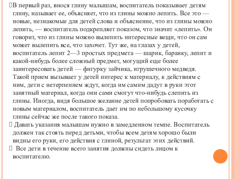 Давать указания малышам нужно в замедленном темпе. Воспитатель должен так стоять перед детьми, чтобы всем детям хорошо были видны его руки, его действия с глиной, результат этих действий.