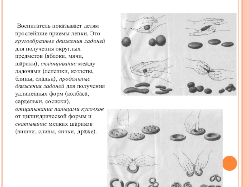 Слайд 17 Воспитатель показывает детям простейшие приемы лепки. Это кругообразные движения ладоней