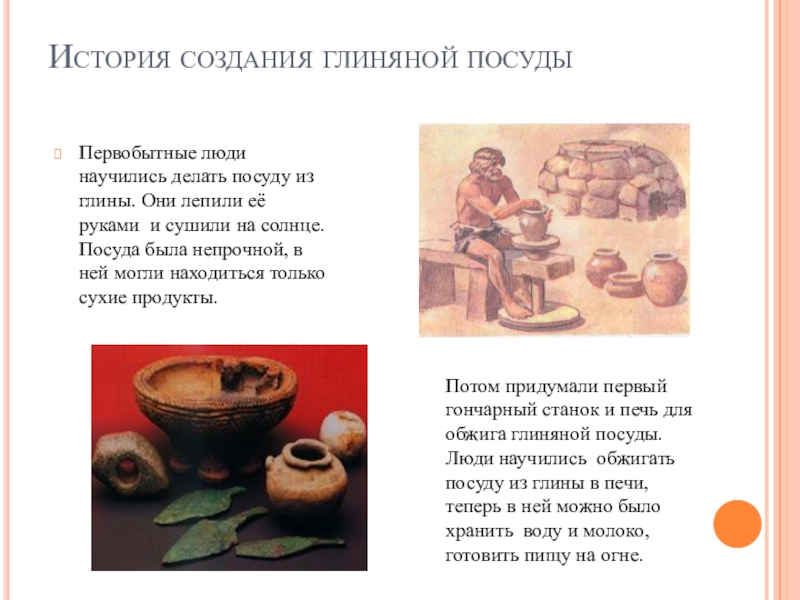 Потом придумали первый гончарный станок и печь для обжига глиняной посуды. Люди научились обжигать посуду из глины в печи, теперь в ней можно было хранить воду и молоко, готовить пищу на огне.