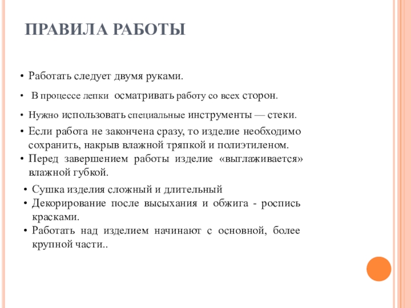 2.Нельзя делать резких движений стекой при работе с глиной в направлении радом сидящего человека 3. При работе, глина находится в специальных отведенных полиэтиленовых кульках
