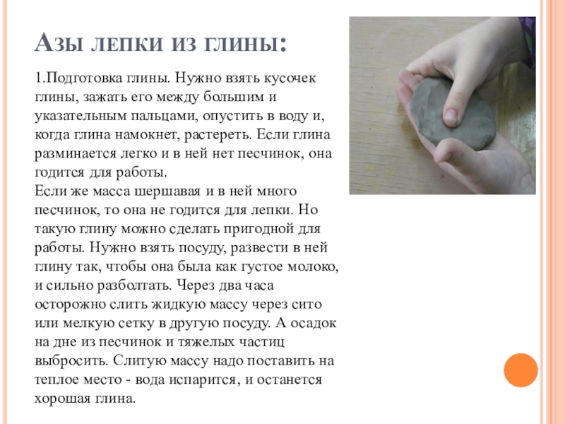 между большим и указательным пальцами, опустить в воду и, когда глина намокнет, растереть. Если глина разминается легко и в ней нет песчинок, она годится для работы.