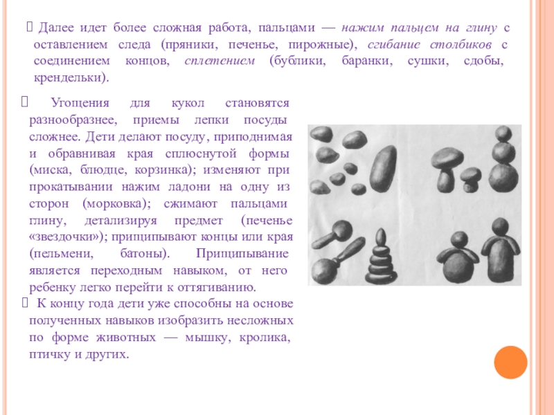 делают посуду, приподнимая и обравнивая края сплюснутой формы (миска, блюдце, корзинка); изменяют при прокатывании нажим ладони на одну из сторон (морковка); сжимают пальцами глину, детализируя предмет (печенье «звездочки»); прищипывают концы или края (пельмени, батоны). Прищипывание является переходным навыком, от него ребенку легко перейти к оттягиванию.