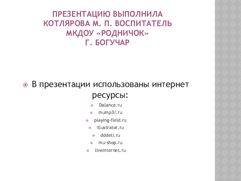 Презентацию выполнила Котлярова М. П. воспитатель  МКДОУ «Родничок»  г. БогучарВ презентации использованы интернет ресурсы:Dalance.rumump3/.ruplaying-field.ruIllustrator.rudddeti.rumu-shop.ruliveinternet.ru