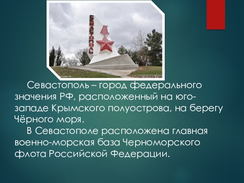 Севастополь – город федерального значения РФ, расположенный на юго-западе Крымского полуострова, на берегу Чёрного моря. В Севастополе расположена главная военно-морская база Черноморского флота Российской Федерации.