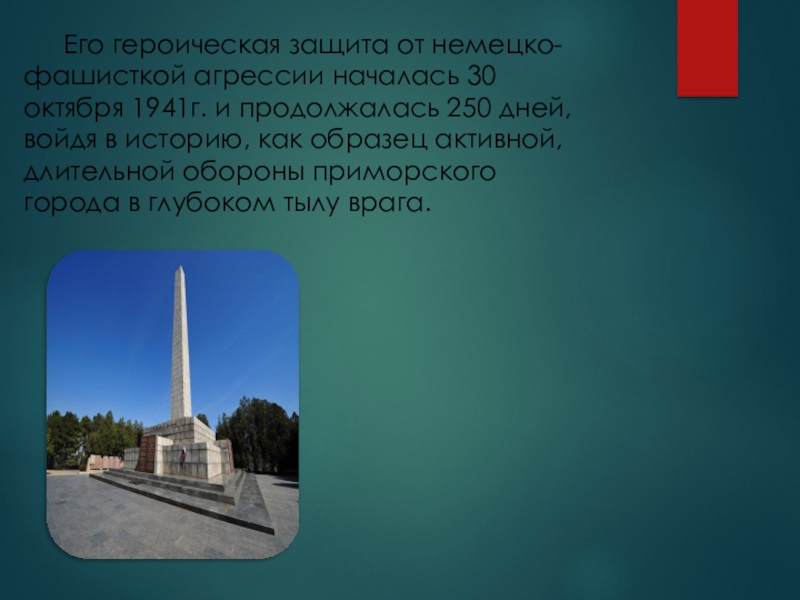 Слайд 3 Его героическая защита от немецко-фашисткой агрессии началась 30 октября 1941г. и