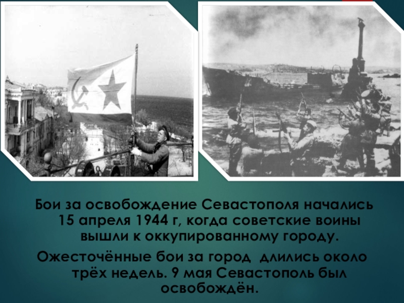 Ожесточённые бои за город длились около трёх недель. 9 мая Севастополь был освобождён.