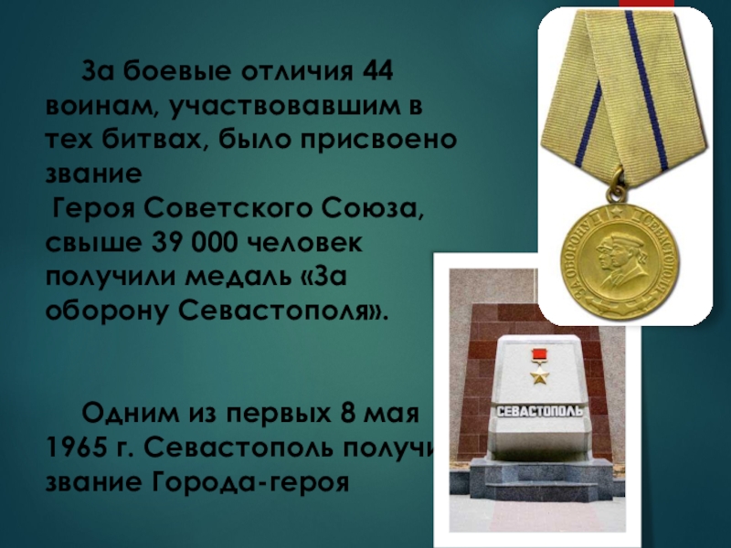 Героя Советского Союза, свыше 39 000 человек получили медаль «За оборону Севастополя».