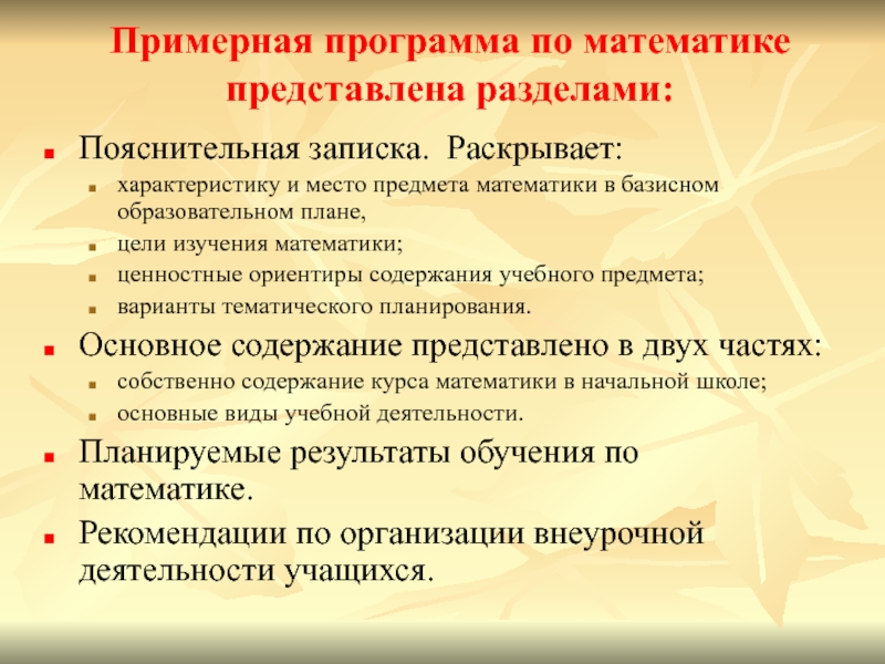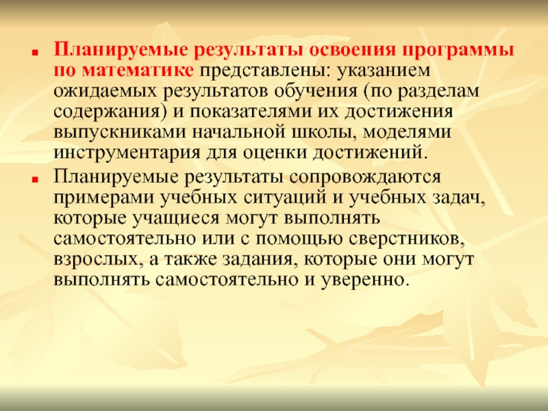 Слайд 14Планируемые результаты освоения программы по математике представлены: указанием ожидаемых результатов обучения
