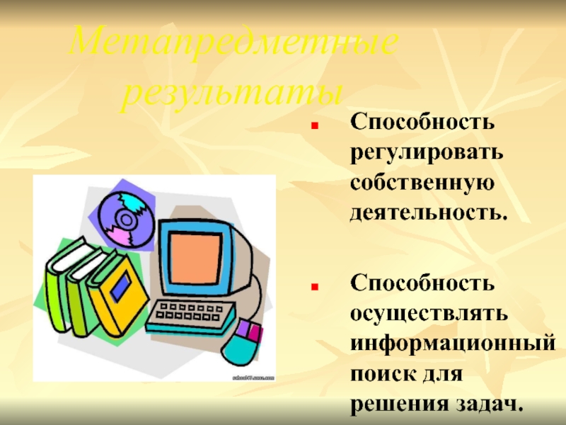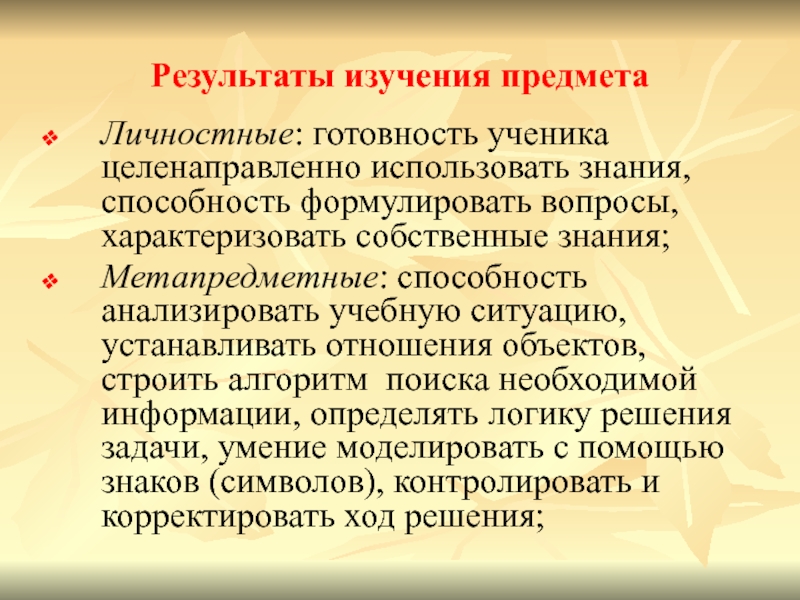 Метапредметные: способность анализировать учебную ситуацию, устанавливать отношения объектов, строить алгоритм поиска необходимой информации, определять логику решения задачи, умение моделировать с помощью знаков (символов), контролировать и корректировать ход решения;
