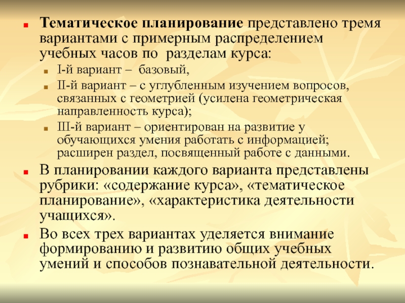 Слайд 7Тематическое планирование представлено тремя вариантами с примерным распределением учебных часов по