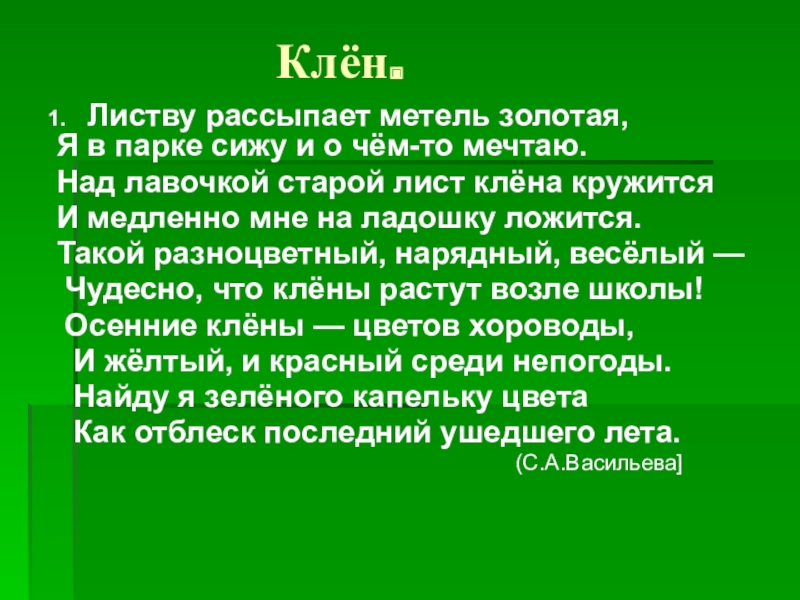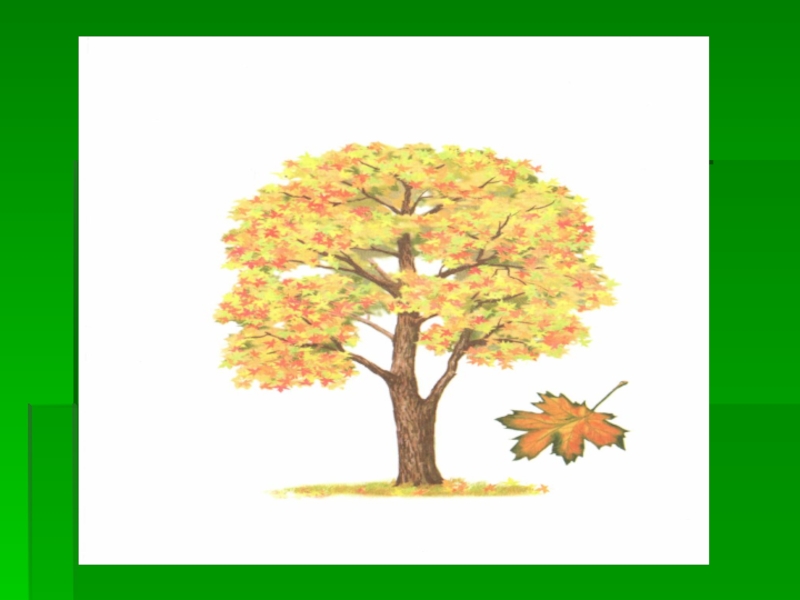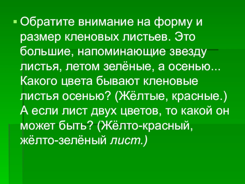 Слайд 26Обратите внимание на форму и размер кленовых листьев. Это большие, напоминающие