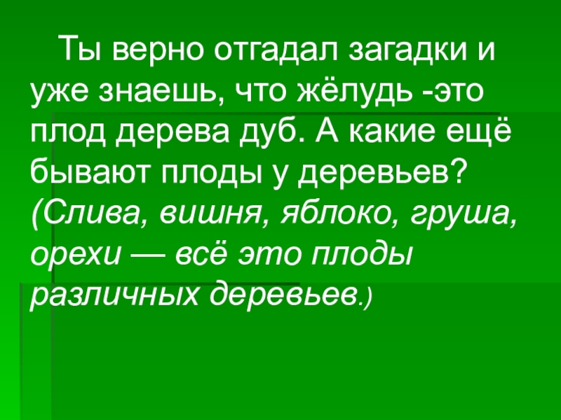 Слайд 20 Ты верно отгадал загадки и уже знаешь, что жёлудь -это плод