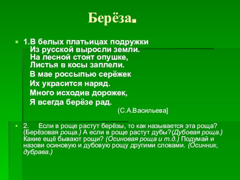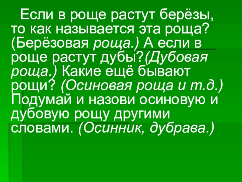 2. Если в роще растут берёзы, то как называется эта роща? (Берёзовая роща.) А если в роще растут дубы?(Дубовая роща.) Какие ещё бывают рощи? (Осиновая роща и т.д.) Подумай и назови осиновую и дубовую рощу другими словами. (Осинник, дубрава.)