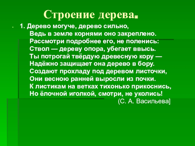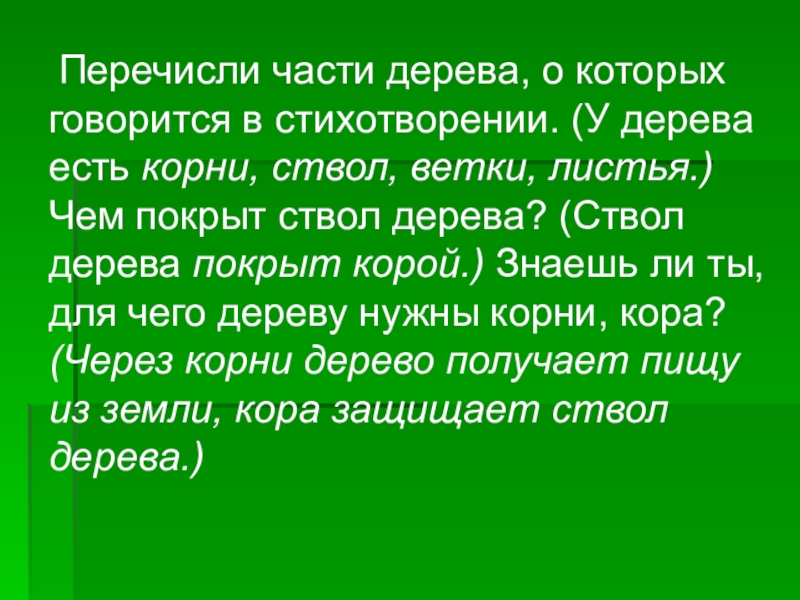 Слайд 13 Перечисли части дерева, о которых говорится в стихотворении. (У дерева