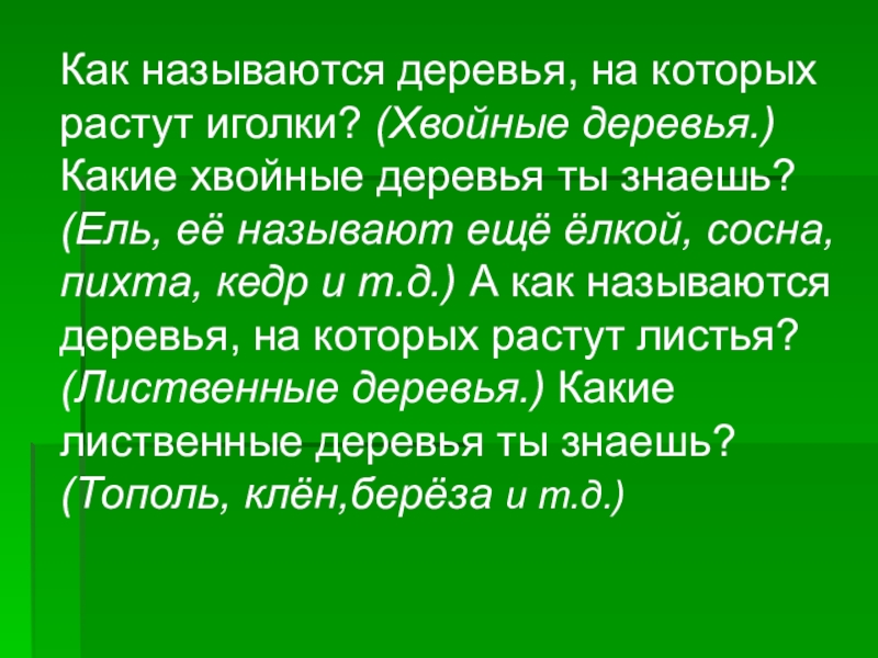 деревья ты знаешь? (Ель, её называют ещё ёлкой, сосна, пихта, кедр и т.д.) А как называются деревья, на которых растут листья? (Лиственные деревья.) Какие лиственные деревья ты знаешь? (Тополь, клён,берёза и т.д.)