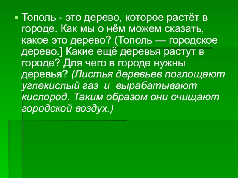 нём можем сказать, какое это дерево? (Тополь — городское дерево.] Какие ещё деревья растут в городе? Для чего в городе нужны деревья? (Листья деревьев поглощают углекислый газ и вырабатывают кислород. Таким образом они очищают городской воздух.)