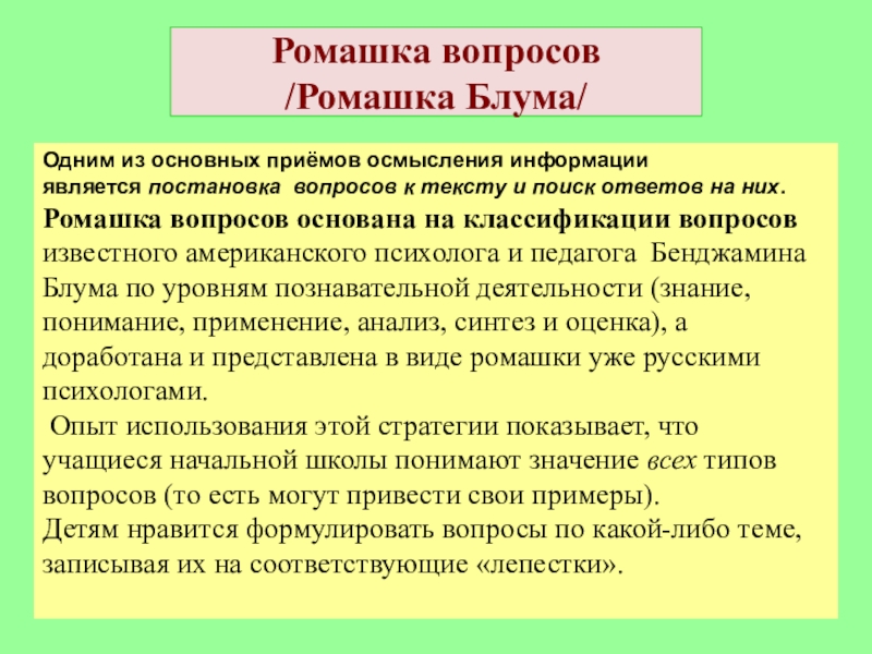 Простые вопросы. Отвечая на них, нужно назвать какие-то факты, вспомнить, воспроизвести некую информацию.