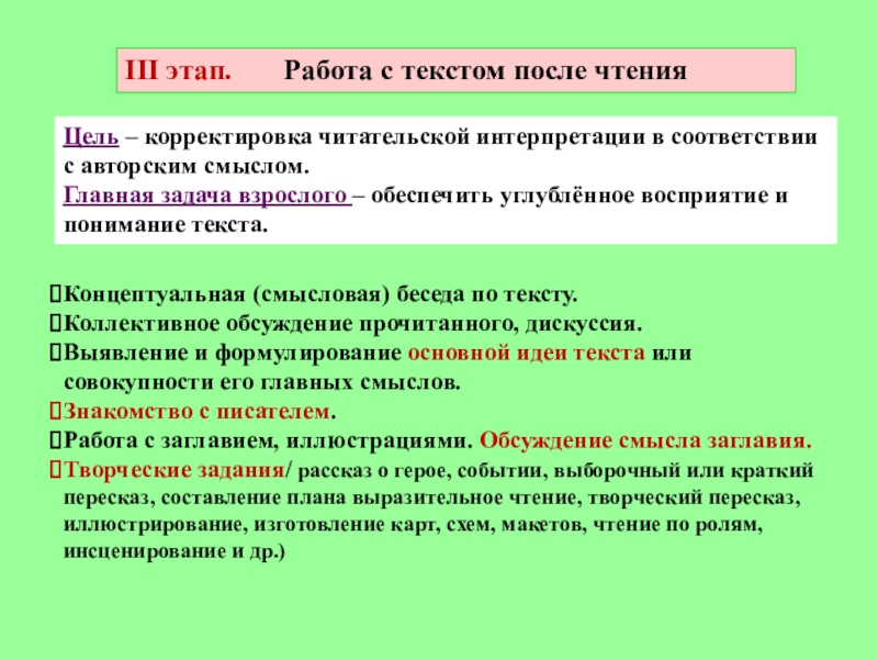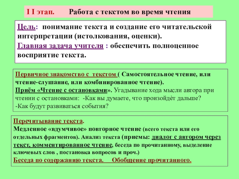 Цель: понимание текста и создание его читательской интерпретации (истолкования, оценки).