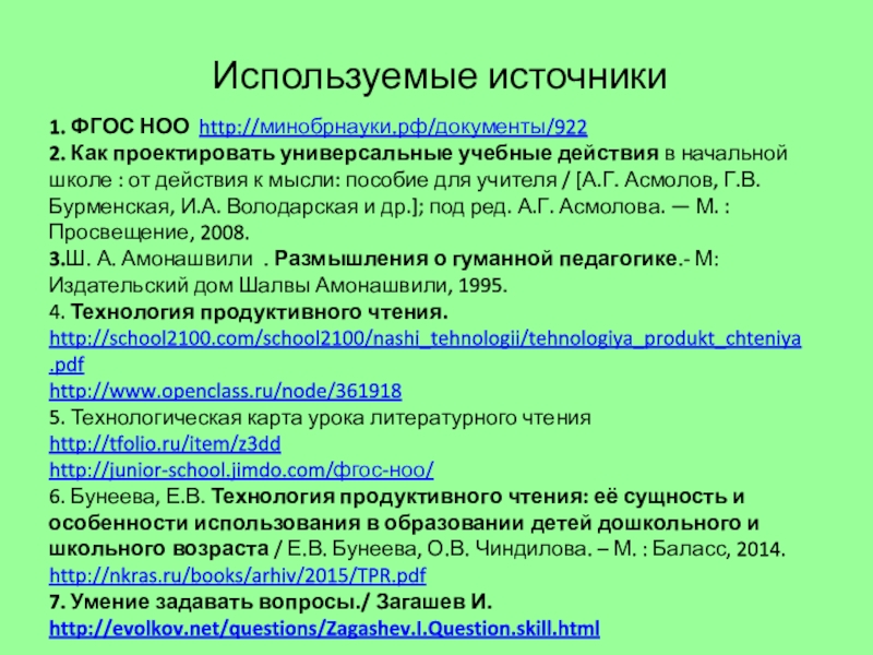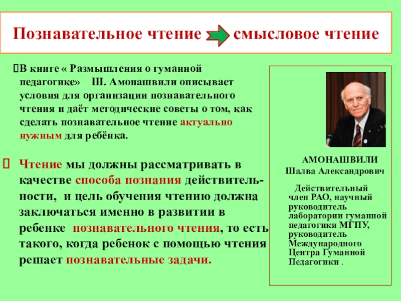 В книге « Размышления о гуманной педагогике» Ш. Амонашвили описывает условия для организации познавательного чтения и даёт методические советы о том, как сделать познавательное чтение актуально нужным для ребёнка.