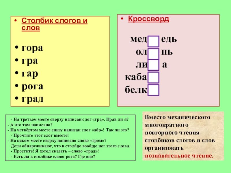 Вместо механического многократного повторного чтения столбиков слогов и слов организовать познавательное чтение.