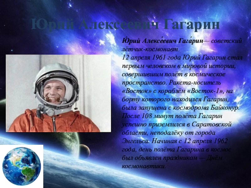 Ю́рий Алексе́евич Гага́рин— советский лётчик-космонавт.