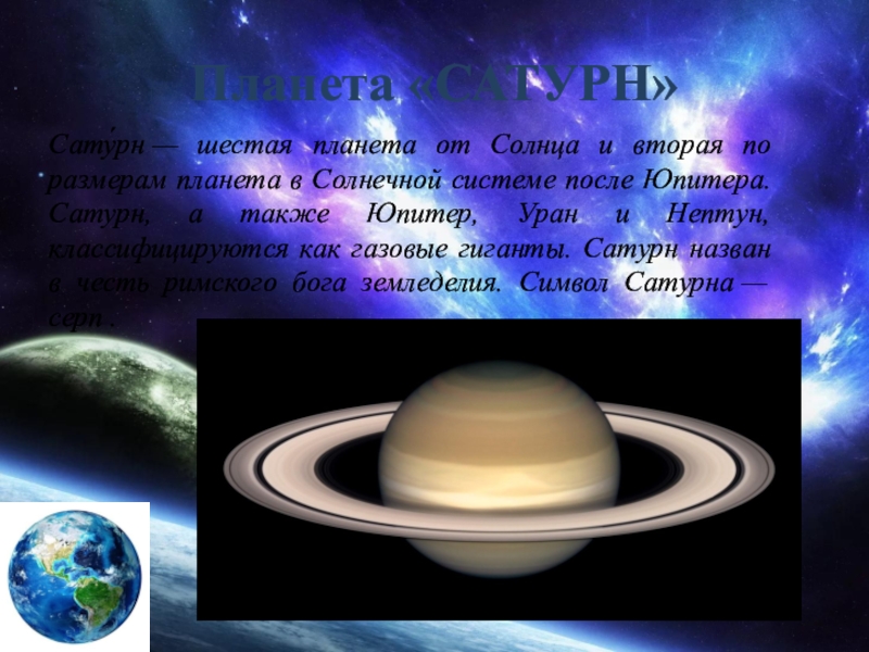 в Солнечной системе после Юпитера. Сатурн, а также Юпитер, Уран и Нептун, классифицируются как газовые гиганты. Сатурн назван в честь римского бога земледелия. Символ Сатурна — серп .