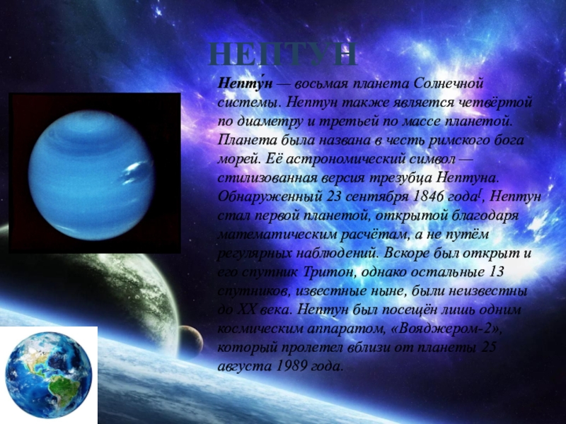 Непту́н — восьмая планета Солнечной системы. Нептун также является четвёртой по диаметру
