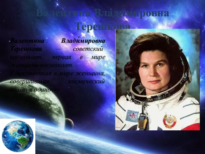 Валентина Влади́мировна Терешко́ва — советский космонавт, первая в мире