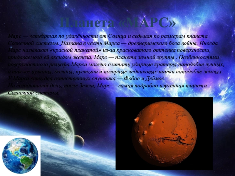 планета Солнечной системы. Названа в честь Марса — древнеримского бога войны. Иногда Марс называют «красной планетой» из-за красноватого оттенка поверхности, придаваемого ей оксидом железа. Марс — планета земной группы . Особенностями поверхностного рельефа Марса можно считать ударные кратеры наподобие лунных, а также вулканы, долины, пустыни и полярные ледниковые шапки наподобие земных. У Марса есть два естественных спутника — Фобос и Деймос.