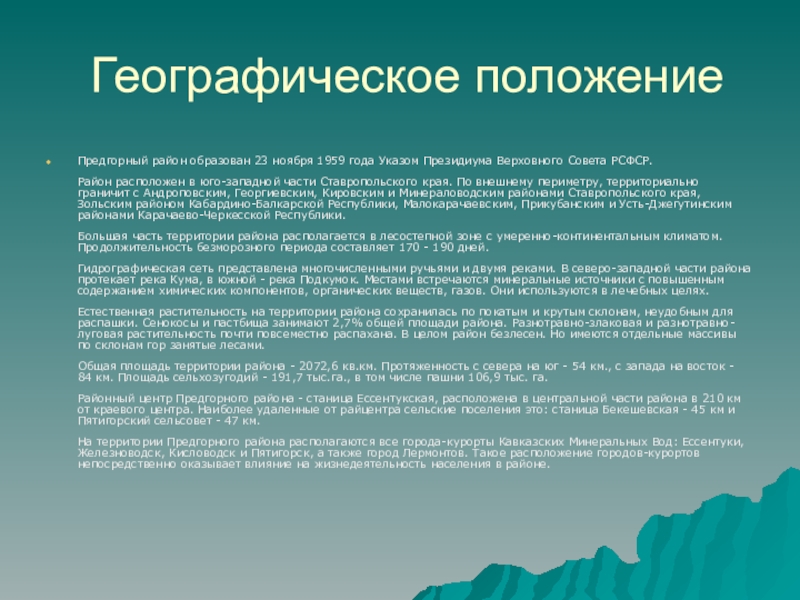 Предгорный район образован 23 ноября 1959 года Указом Президиума