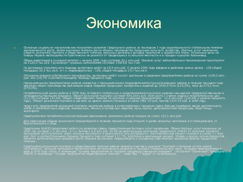 характеризуются стабильными темпами экономического роста. Более высокими темпами росли объемы производства продукции сельского хозяйства, платных услуг населению, оборота розничной торговли и общественного питания, реальных денежных доходов населения и заработной платы. Розничные цены на товары первой необходимости практически не разнятся от продающихся в сельской местности и в городах-курортах Кавминвод.