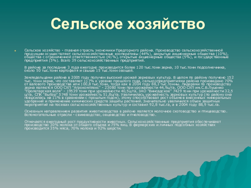 Сельское хозяйство - главная отрасль экономики Предгорного района. Производство сельскохозяйственной