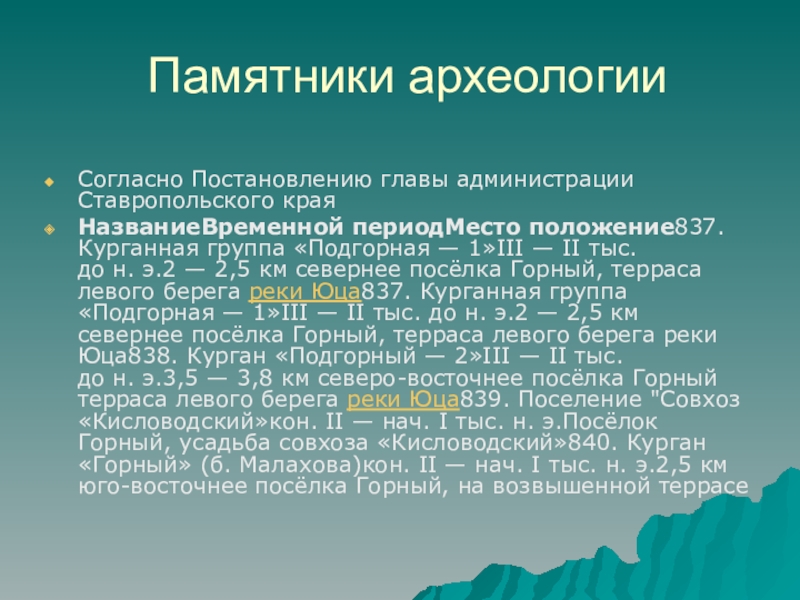 «Подгорная — 1»III — II тыс. до н. э.2 — 2,5 км севернее посёлка Горный, терраса левого берега реки Юца837. Курганная группа «Подгорная — 1»III — II тыс. до н. э.2 — 2,5 км севернее посёлка Горный, терраса левого берега реки Юца838. Курган «Подгорный — 2»III — II тыс. до н. э.3,5 — 3,8 км северо-восточнее посёлка Горный терраса левого берега реки Юца839. Поселение "Совхоз «Кисловодский»кон. II — нач. I тыс. н. э.Посёлок Горный, усадьба совхоза «Кисловодский»840. Курган «Горный» (б. Малахова)кон. II — нач. I тыс. н. э.2,5 км юго-восточнее посёлка Горный, на возвышенной террасе
