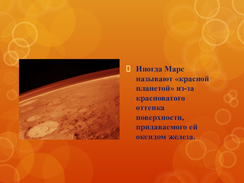 Слайд 4Иногда Марс называют «красной планетой» из-за красноватого оттенка поверхности, придаваемого ей