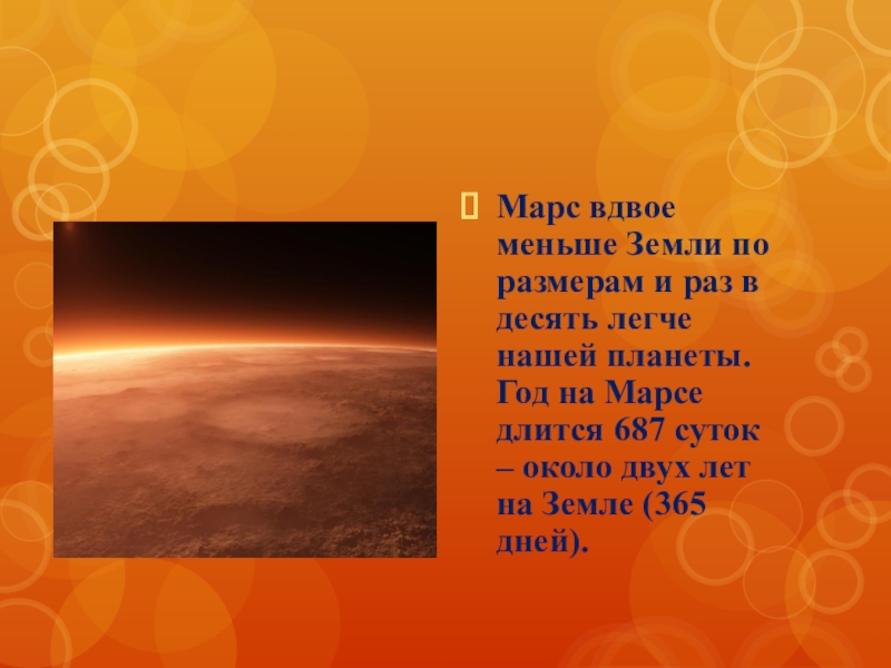 Слайд 5Марс вдвое меньше Земли по размерам и раз в десять легче